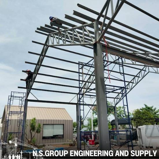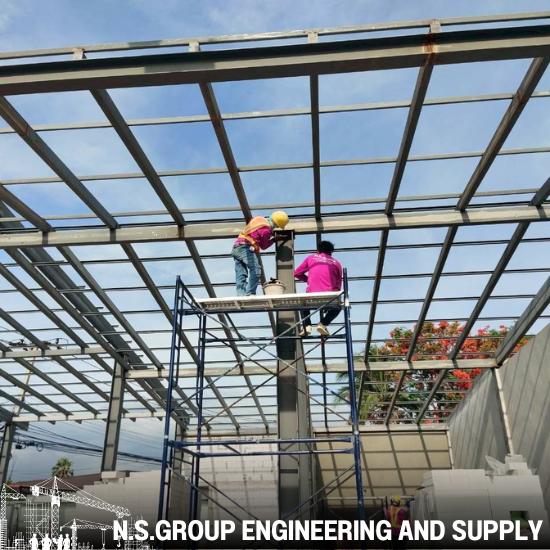 งานโครงสร้างเหล็กและงานคอนสร้างคอนกรีต หลังคาเมทัลชีท ฝ้ายิปซั่ม เดินระบบไฟฟ้ามิเตอร์แยก และเดินระบบประปา ระบบท่อดับเพลิง